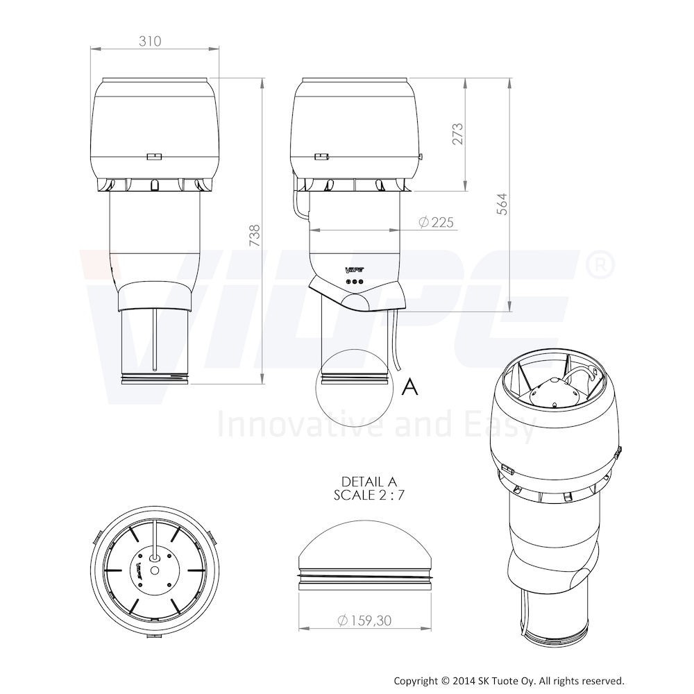 Externí ventilační jednotka od finského výrobce VILPE je vhodná pro instalaci na jakoukoliv střechu - rovnou či šikmou (maximální sklon 57°). Je osazena motorem německé výroby EBM, který dosahuje výkonu 850m3/h.Vyznačuje se lehkostí konstrukce (vnější plášť je zhotovený z vysoce kvalitního polypropylenu), vysokou odolností proti mechanickým poškozením a nepříznivým podmínkám. Anti UV složka zajišťuje stálobarevnost použitého materiálu.