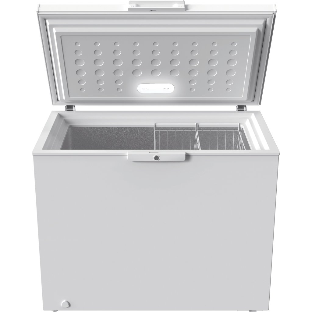 Truhlicová mraznička má systém vyvažování dveří, takže se snadno otevírá a zavírá a při otevření zůstávají dvířka ve stabilní poloze. |