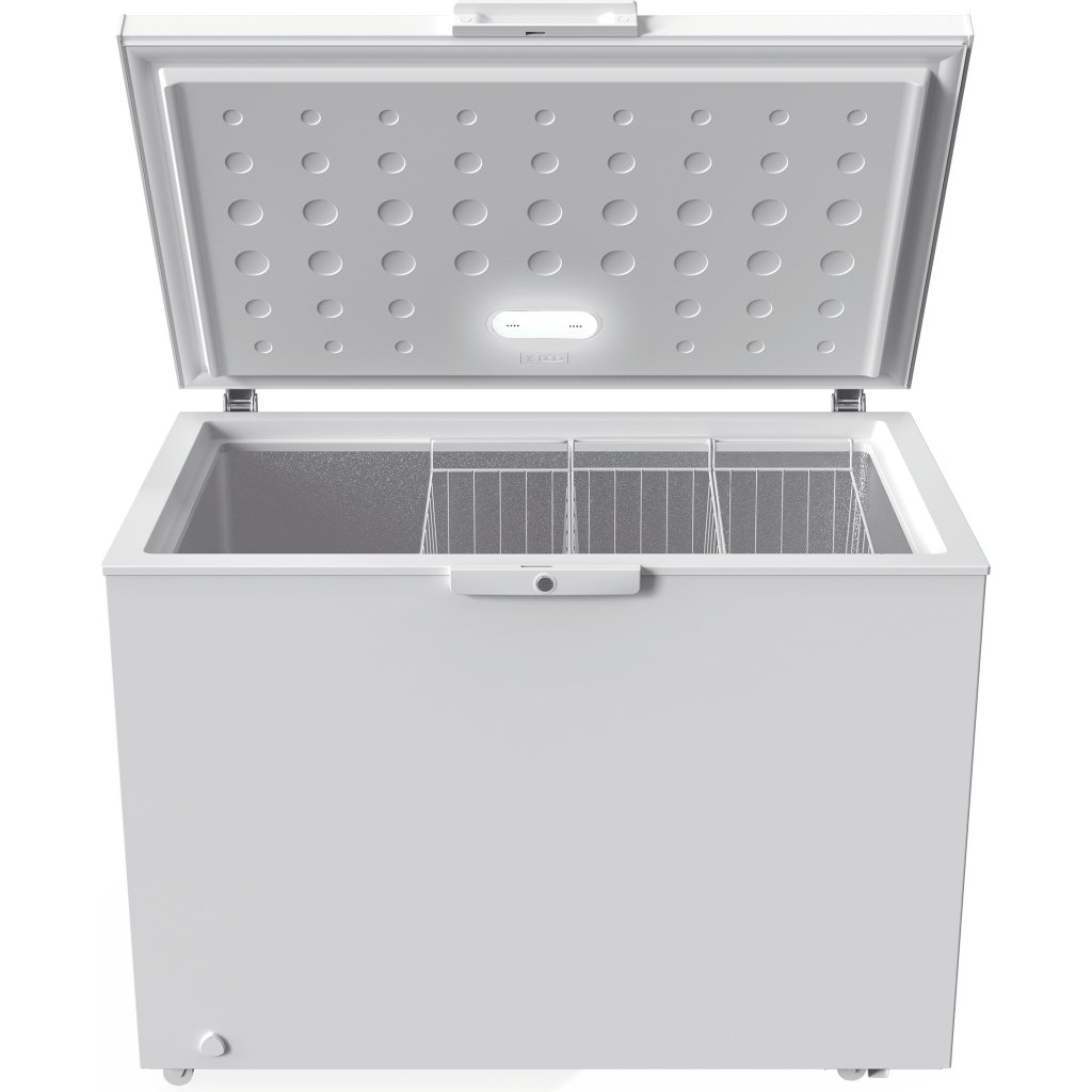 Truhlicová mraznička má systém vyvažování dveří, takže se snadno otevírá a zavírá a při otevření zůstávají dvířka ve stabilní poloze. |